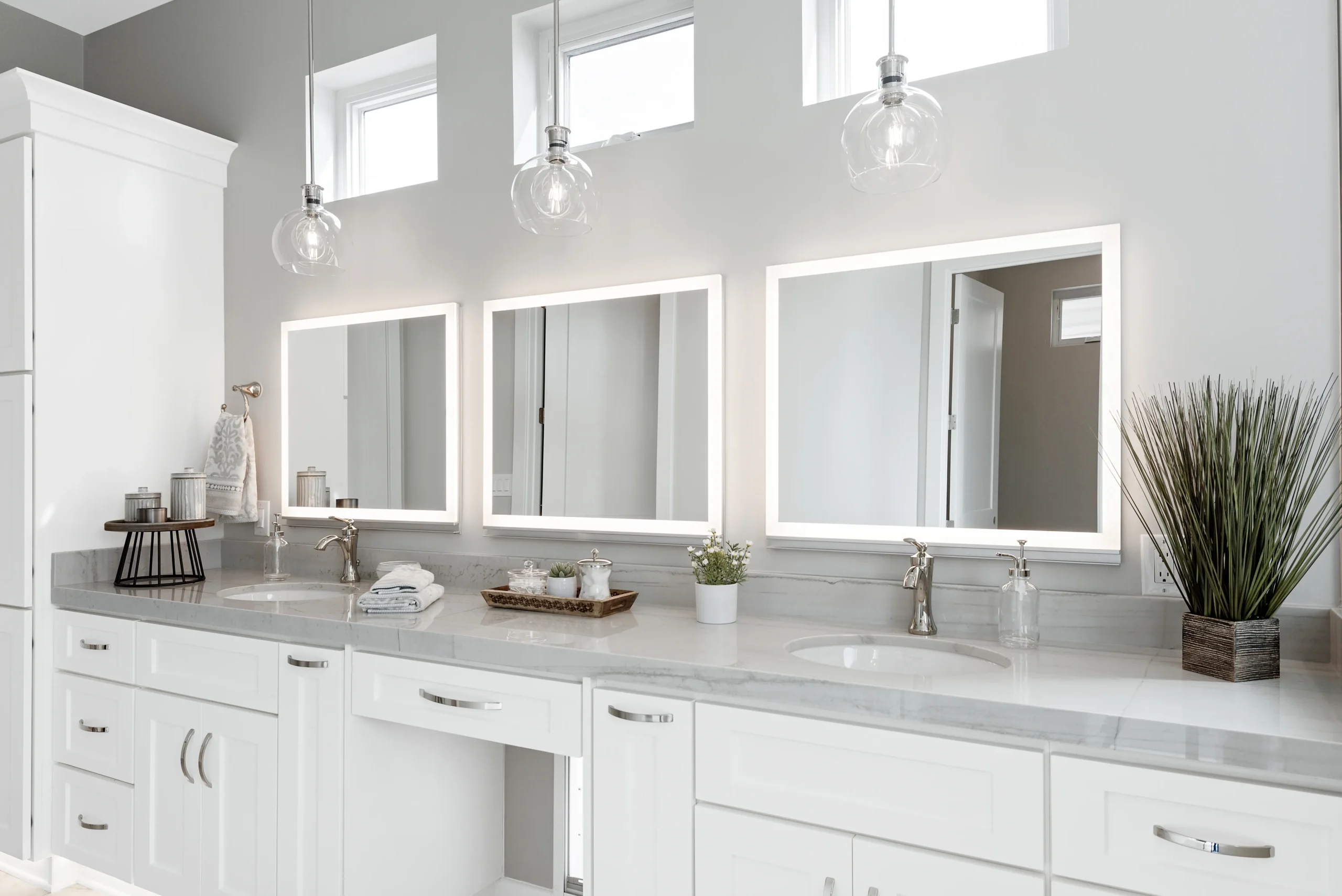 Why one when you can add two? A double vanity—with two sinks and two mirrors—can add a little extra glam to your luxurious spa. The double mirror can make the space look expansive. Plus, if you and your partner share the same bathroom, two vanities will give you a bit of room to spread out as you get ready.