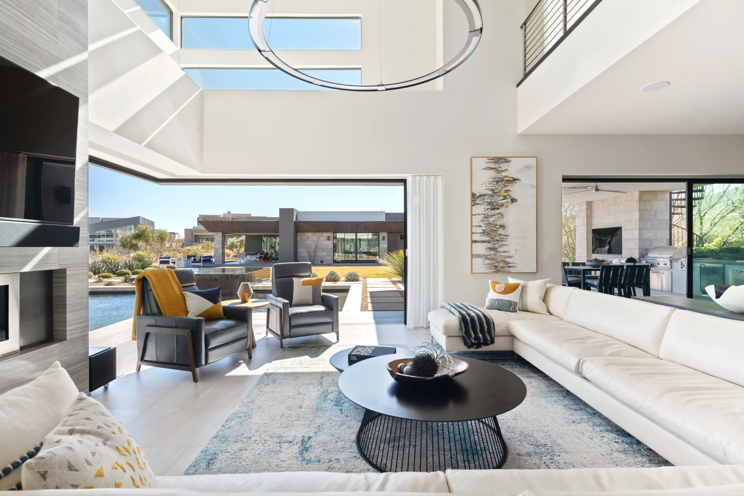 Since we’re talking about luxury homes, you will be looking at furniture made of luxe materials—those that stand the test of time. Luxe leather sofa, glowing brass cocktail table, velvet tufted chaise lounge, Italian marble coffee table, polished stone console, you name it!